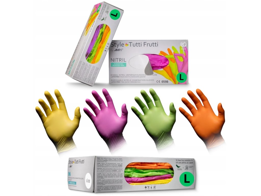 Barevné nitrilové rukavice AMPRI TUTTI FRUTTI jsou nepudrované, nesterilní, texturované na koncích prstů s rovnoměrně rolovaným okrajem. Nabízí uživateli vyšší mechanickou i chemickou odolnost. Jako hypoalergenní nezpůsobují alergické reakce, mají atraktivní provedení v módních barvách. Díky nitrilové směsi lze jejich použití doporučit v průmyslu, protože dokonale chrání před tuky a oleji, dále ve zdravotnictví, kde slouží jako vyšetřovací rukavice s odpovídající ochranou.